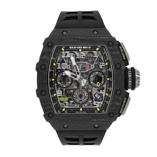The Richard Mille RM11-03 Automatic Winding Flyback Replica is a luxurious watch that is sure to impress. The movement is an automatic caliber RMAC3 with a power reserve of 60 hours and a precision of -3/+3 seconds per day within COSC certification limits. The case is made of carbon and is black in color. with a sapphire crystal and a thickness of 16.23 mm. The bracelet is made of rubber and is adjustable for all sizes. with a 904L stainless steel double-fold clasp.