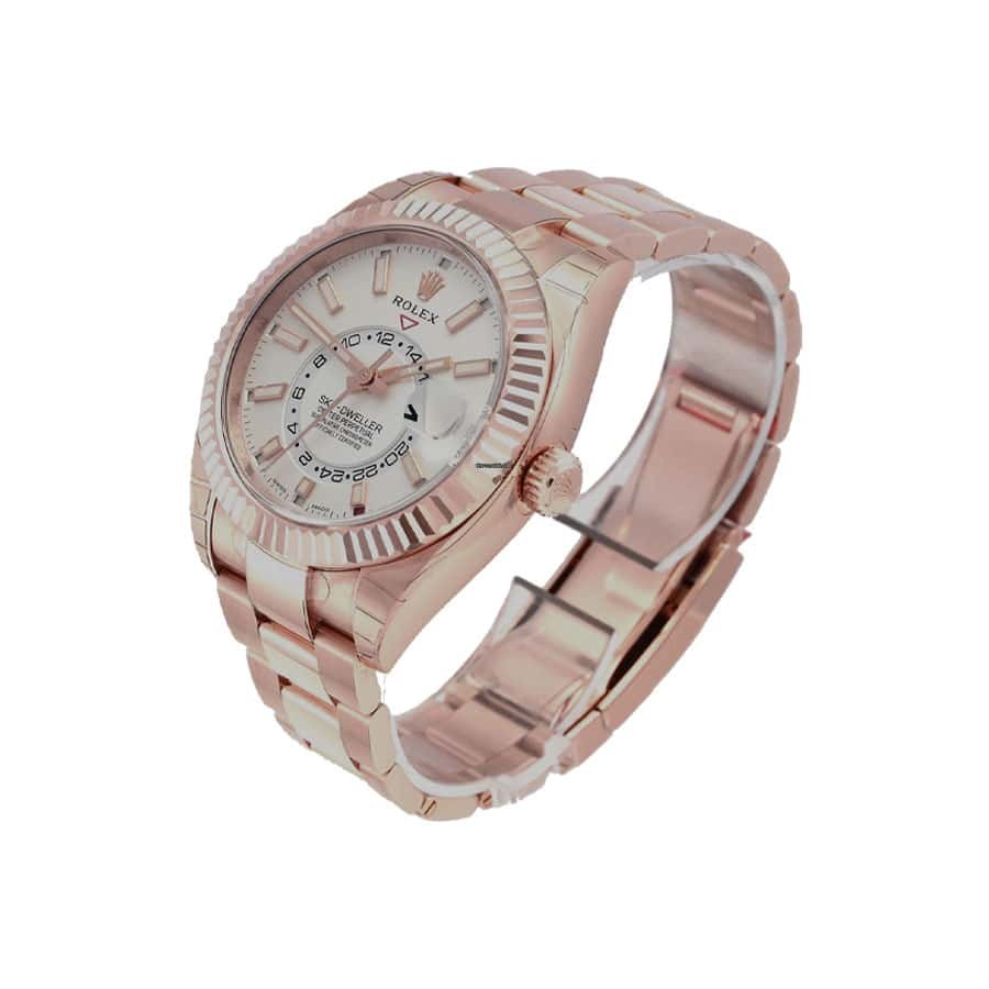 This Rolex Sky-Dweller Rose Gold White Dial 326935-0005 Oyster Replica is a striking watch. The case is made of 904L stainless steel and is rose gold in color. It has a sapphire crystal and is 42.00mm in size with a thickness of 14.10mm. The bracelet is also made of 904L stainless steel and is adjustable for all sizes. It has a fold clasp and is rose gold in color. The dial is white with stick indices and hands made of 904L stainless steel.